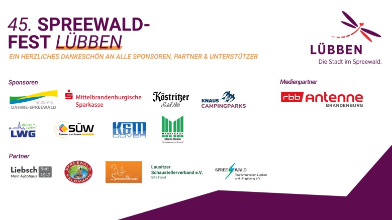 Wir bedanken uns bei unseren Partnern und Sponsoren, die es ermöglichen, das Spreewaldfest zu einem unvergesslichen Erlebnis zu machen. Ohne ihre Unterstützung und Zusammenarbeit wäre die Umsetzung nicht möglich. Wir schätzen die Bedeutung von Kooperationen und freuen uns darauf, auch in Zukunft gemeinsame Wege zu gehen. Ein besonderer Dank geht an: