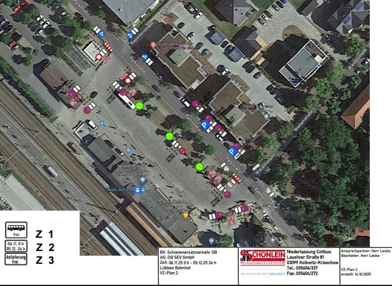 Aufgrund des Schienenersatzverkehrs kommt es im Bereich des Bahnhofsvorplatzes Lübben zu zeitweiligen Sperrungen und Änderungen der Verkehrsführung.