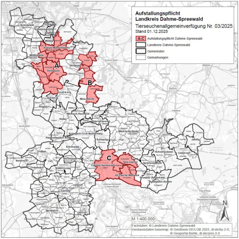 Der Landkreis Dahme-Spreewald lockert weitgehend die zur Eindämmung der Geflügelpest geltenden Schutzmaßnahmen. Die Veterinärbehörde beschränkt in einer Tierseuchenallgemeinverfügung (Amtsblatt Nr. 28 vom 01.12.2025) die Aufstallungspflicht in drei Restriktionszonen, in denen die Nutzgeflügeldichte besonders hoch ist.