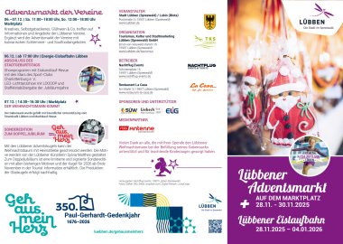 Die Stadt Lübben (Spreewald)/Lubin (Błota) lädt vom 28. bis 30. November zum traditionellen Adventsmarkt ein. Am 01. Advent haben die Geschäfte zum Verkaufsoffenen Sonntag von 13:00 bis 20:00 Uhr geöffnet. Gekrönt wird das Programm mit der Stadtwerke Eislaufbahn Lübben vom 28. November bis zum 04. Januar. Das Programm gibt es unter luebben.de.
