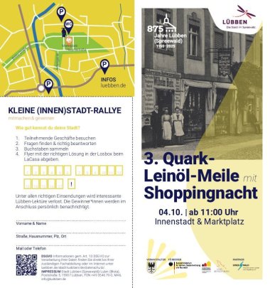 Am 04. Oktober lädt von 15:00 bis 21:00 Uhr die Shoppingnacht in die Lübbener Innenstadt ein. Dem voraus geht die 3. Quark-Leinöl-Meile von 11:00 bis 17:00 Uhr auf dem Marktplatz. Der Eintritt ist frei.