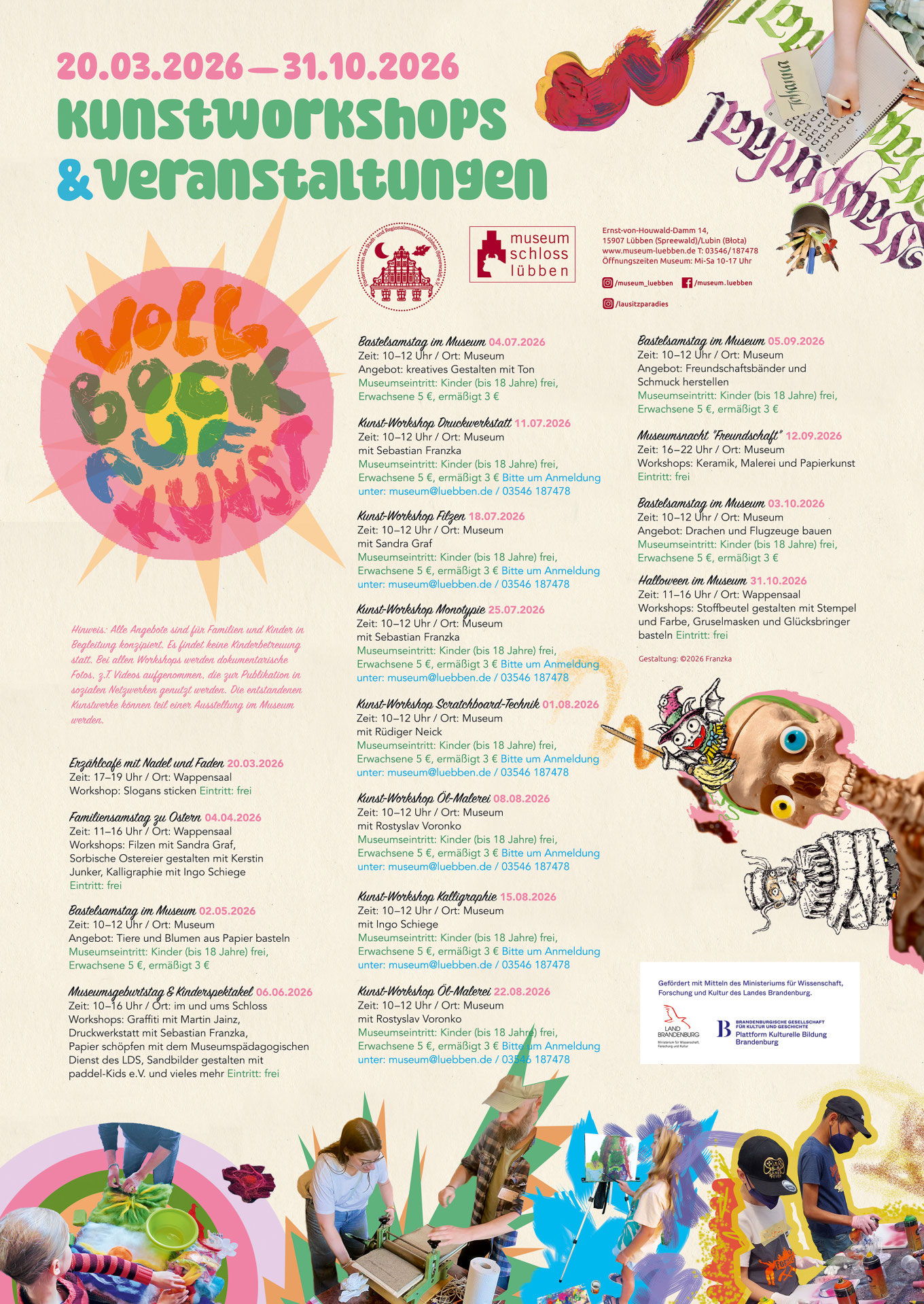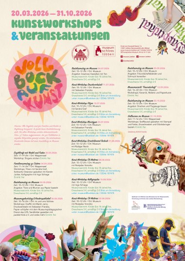 Das Museum Schloss Lübben lädt 2026 unter dem Motto „Voll Bock auf Kunst“ jeden ersten Samstag im Monat bis Oktober sowie jeden Samstag in den Sommerferien zu kreativen Workshops für Kinder und Familien ein. Angeboten werden unter anderem Basteln, Filzen, Malerei, Kalligrafie und Monotypie. Der nächste Workshop findet am 2. Mai von 10:00 bis 12:00 Uhr statt. Dabei werden Tiere und Blumen aus Papier gebastelt; das Material wird bereitgestellt. Kinder und Jugendliche bis 18 Jahre haben freien Eintritt, Erwachsene zahlen 5 €, ermäßigt 3 €. Die entstandenen Kunstwerke können mitgenommen oder Teil einer Ausstellung im Museum Schloss Lübben werden.