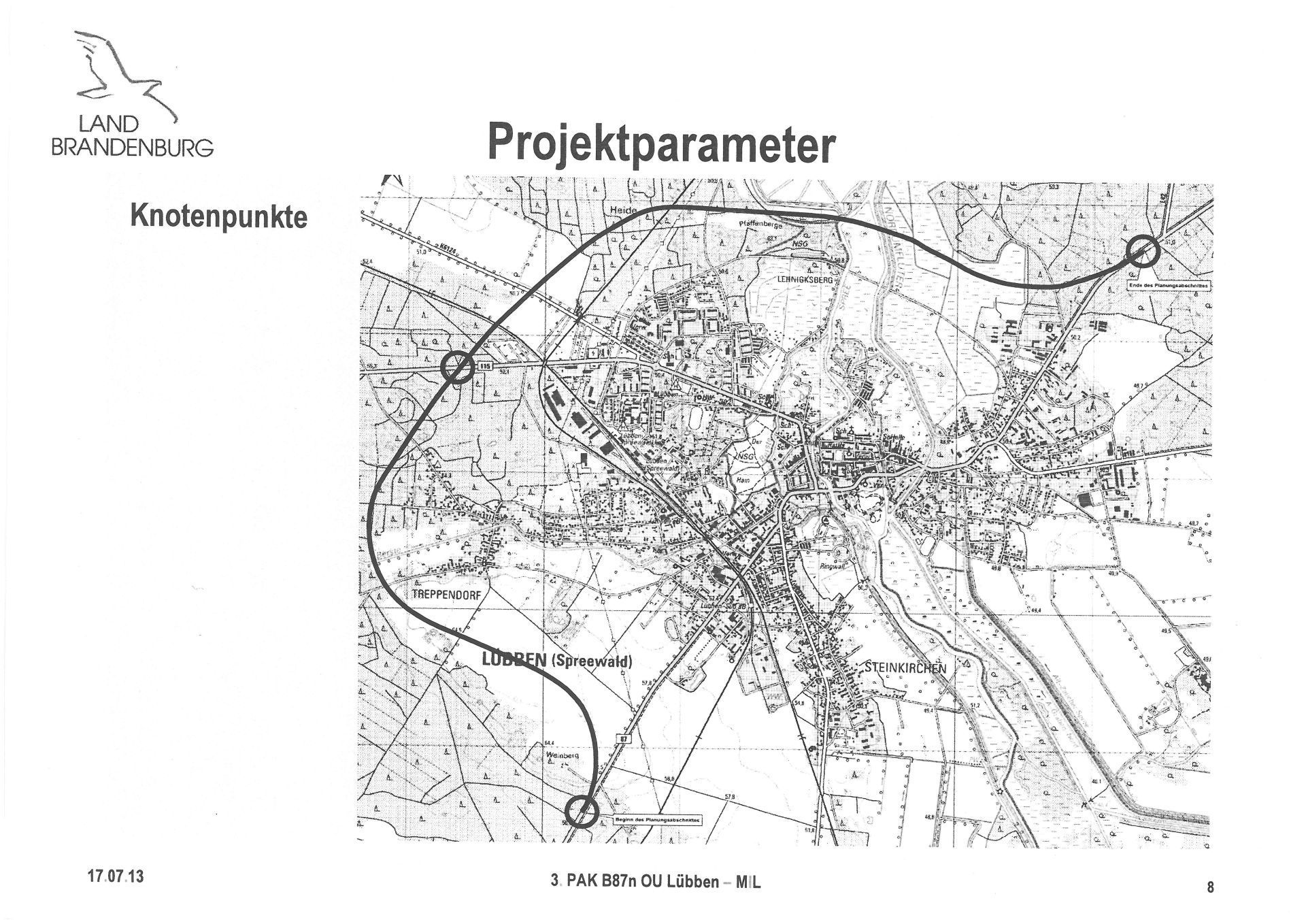 Für die Ortsumgehung der B87 in Lübben (Spreewald) / Lubin (Blota) kann voraussichtlich im Jahr 2018 mit dem Planfeststellungsverfahren begonnen werden. Das berichtete Egbert Neumann, Abteilungsleiter Verkehr beim Brandenburgischen Ministerium für Infrastruktur und Landesplanung (MIL), vor dem projektbegleitenden Arbeitskreis. Die Planungen würden derzeit dem Bundesverkehrsministerium vorliegen, nach Erteilung des Gesehen-Vermerks könne mit der weiteren Baurechtsbeschaffung begonnen werden.