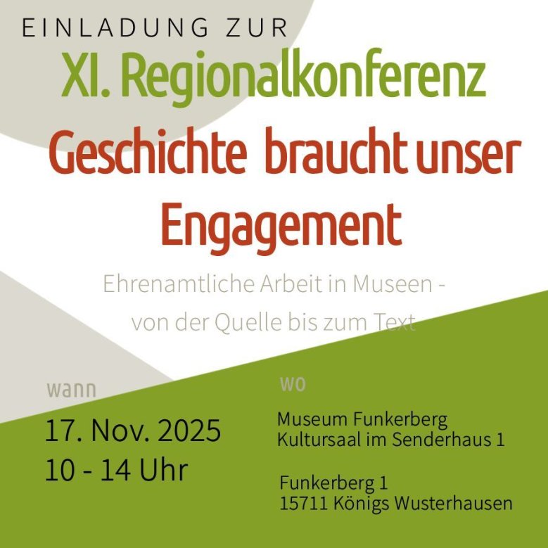 Ein bedeutender Teil der historischen Arbeit im Landkreis Dahme-Spreewald wird durch oder mit der Hilfe von Ehrenamtlichen geleistet. Auch unsere Museen werden häufig von einer ehrenamtlichen Vereinsstruktur unterstützt. Genau dieser ehrenamtlichen Geschichtsarbeit wollen wir uns in dieser XI. Regionalkonferenz widmen. Sie erhalten im Nachgang eine Anmeldebestätigung mit Details zum Programm von uns. Wir freuen uns auf Ihre Teilnahme.