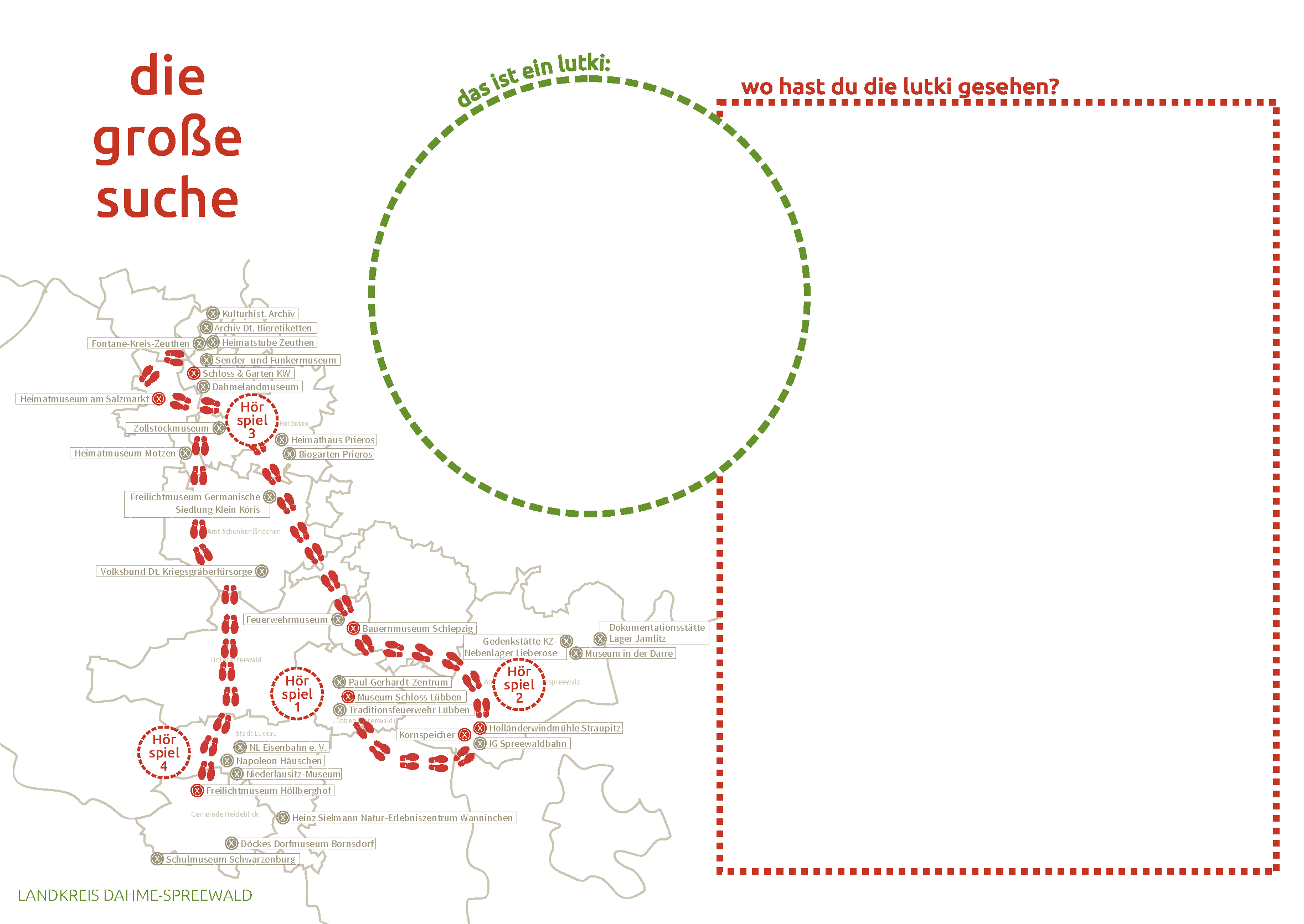 Vorleserin Ellen DöringIm Februar haben wir uns auf die Suche nach den Lutki gemacht. In einem Hörspiel begleiteten die Kinder (und Erwachsenen) eine Lübbener Lutki-Familie auf ihren Abenteuern durch den Landkreis. Von Ost nach West und von Nord nach Süd. Dabei haben sie allerlei tolle Museen und Landschaften entdeckt.