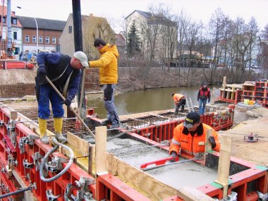 Am 28. April wurde die Brückenplatte betoniert. Zwei Pumpen arbeiteten parallel auf beiden Seiten der Brücke. Anschließend folgten das Vorspannen der Spannglieder und das Vergießen der Brückenlager. Weitere Schalungsarbeiten für Kammerwand und Kappen schlossen sich an. Die Arbeiten verliefen planmäßig, sodass die Eröffnung am 19. Juni gesichert war.