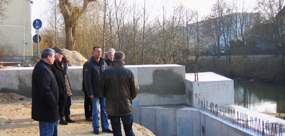 Im Februar 2010 wurde die Baustelle an der Spreebrücke nach der Winterpause wieder eingerichtet. Die Firma Kussatz begann unter der Bauleitung von Lothar Bretterbauer mit der Absicherung und Vorbereitung der Fläche. Es folgten Bewehrung und Schalung der Fundamente. Um den durch den Winter entstandenen Bauverzug aufzuholen, wurden beide Widerlager gleichzeitig errichtet und auch samstags gearbeitet. So konnten rund zweieinhalb Wochen aufgeholt werden. Die Stadtverwaltung begleitete das Projekt aktiv, der Bauausschuss informierte sich regelmäßig vor Ort.