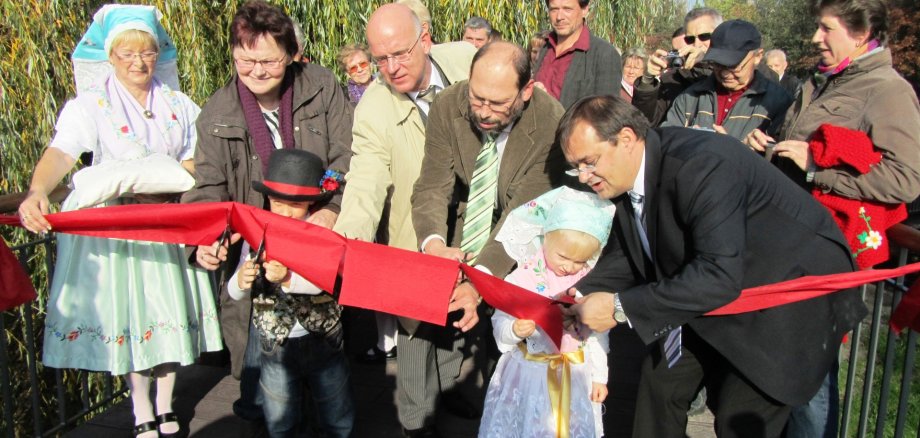 Am 29. Oktober 2011 wurde in Lübben die längste barrierefreie Fußgängerbrücke im Spreewald feierlich eingeweiht. Bürgermeister Lothar Bretterbauer a. D. eröffnete gemeinsam mit Infrastrukturminister Jörg Vogelsänger, Landtagsabgeordneter Sylvia Lehmann und Landrat Stephan Loge das 107 Meter lange Bauwerk, das die Schlossinsel mit Naturbadestelle und künftigem Wasserwanderstützpunkt verbindet. Die Kosten von rund 2,2 Mio. Euro wurden überwiegend durch Fördermittel gedeckt, darunter 1,6 Mio. Euro aus dem Programm ILE/LEADER. Bretterbauer dankte Architekt Markus Thelen, den beteiligten Firmen Strabag AG und Jung GmbH sowie den Fördermittelgebern. Vogelsänger lobte den neuen Freizeitbereich als Gewinn für die gesamte Region, Landrat Loge stellte weitere Fördermittel in Aussicht. Zahlreiche Besucher nutzten die Gelegenheit zum ersten Spaziergang über die Brücke und feierten bei Musik, Trachten und Wasserspielen ein gelungenes Eröffnungsfest.